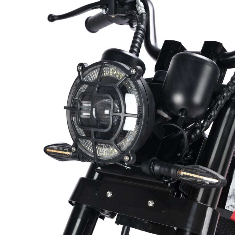 Рама выполнена из стали, что гарантирует прочность и долговечность конструкции, а вес устройства составляет около 100 кг. Для комфортной езды предусмотрена двухподвесная пружинная подвеска мотоциклетного типа, которая эффективно сглаживает неровности дороги. Тормозная система — дисковая гидравлическая, обеспечивающая надёжное и безопасное торможение в любых условиях.