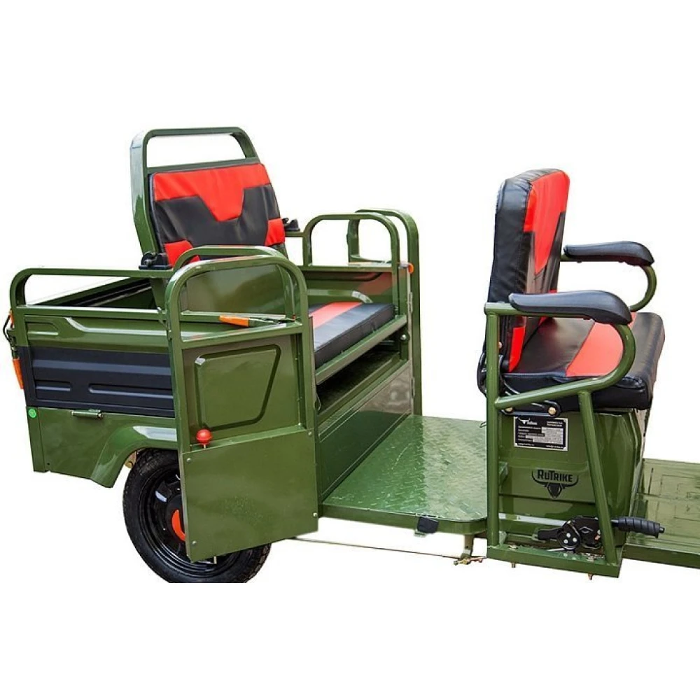 Груовой электротрицикл Rutrike Вояж-П 1200 Трансформер 60В 80 Вт  в зеленом цветовом оттенке - техника, предназначенная для лиц с активной жизненной позицией, жителей сельских районов, для которых отдых на свежем воздухе находится на первом месте. Электротрицикл грузоподъемностью до 400кг идеально подходит для вылазок с друзьями, езды на рыбалку и другие мероприятия на природе.