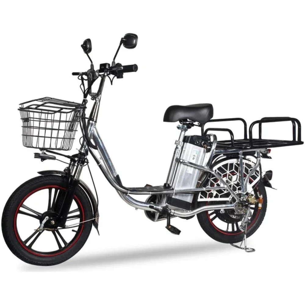Помимо электродвигателя, Minako V12 Lux оборудован механическим приводом в виде односкоростной цепной трансмиссии. Седло велосипеда широкое и мягкое, что позволяет с комфортом ездить даже самые большие расстояния. Комплектация велосипеда Minako V12 Lux богата – в отличие от конкурентов он с завода имеет зеркала заднего вида, защитные крылья, подножку, корзинку и багажник для личных вещей.